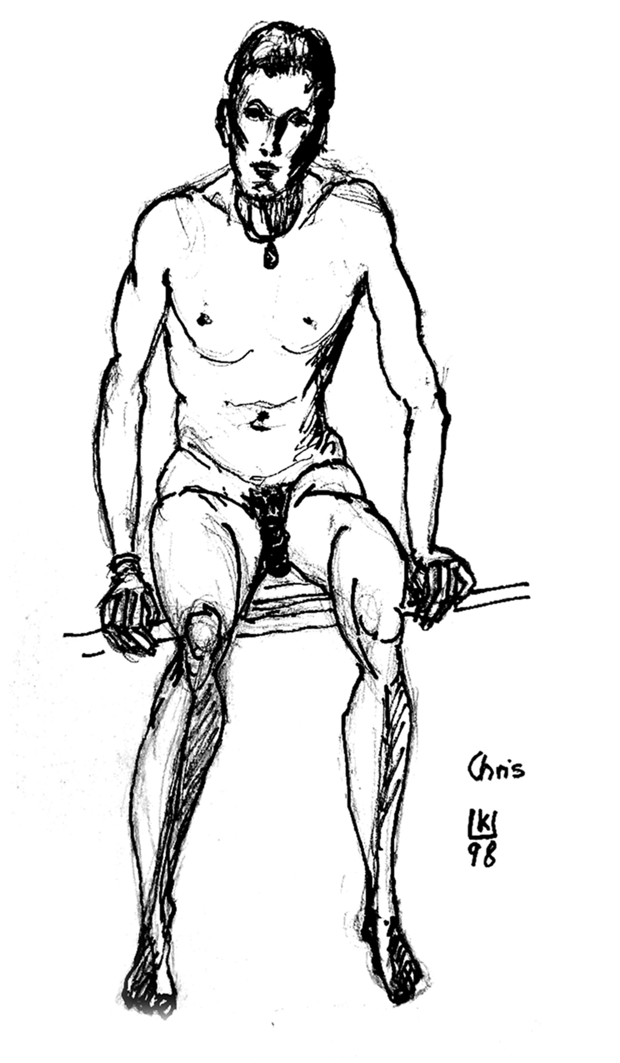 Chris auf Tischkante 1998 Kohlezeichnung 44x23