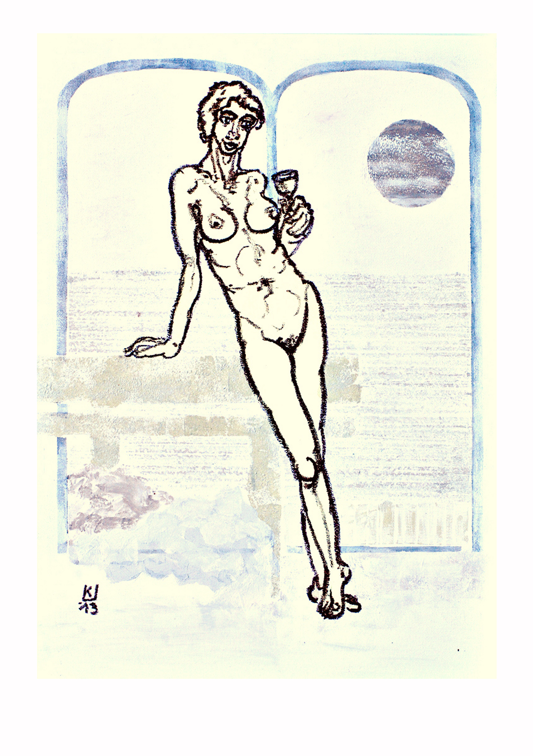 Frau mit Glas am Tisch 1993 Zeichnung farbfondiert 70x50