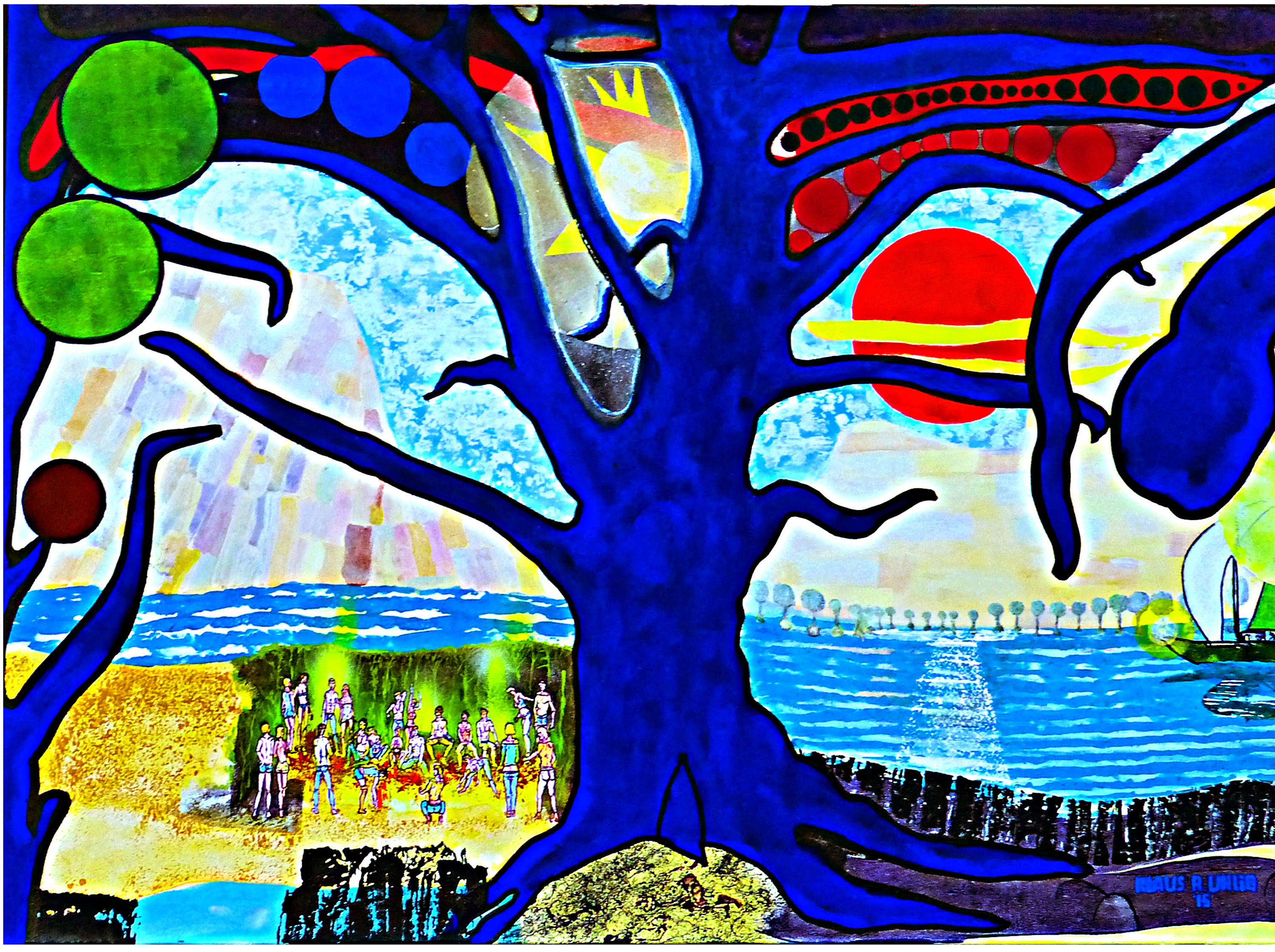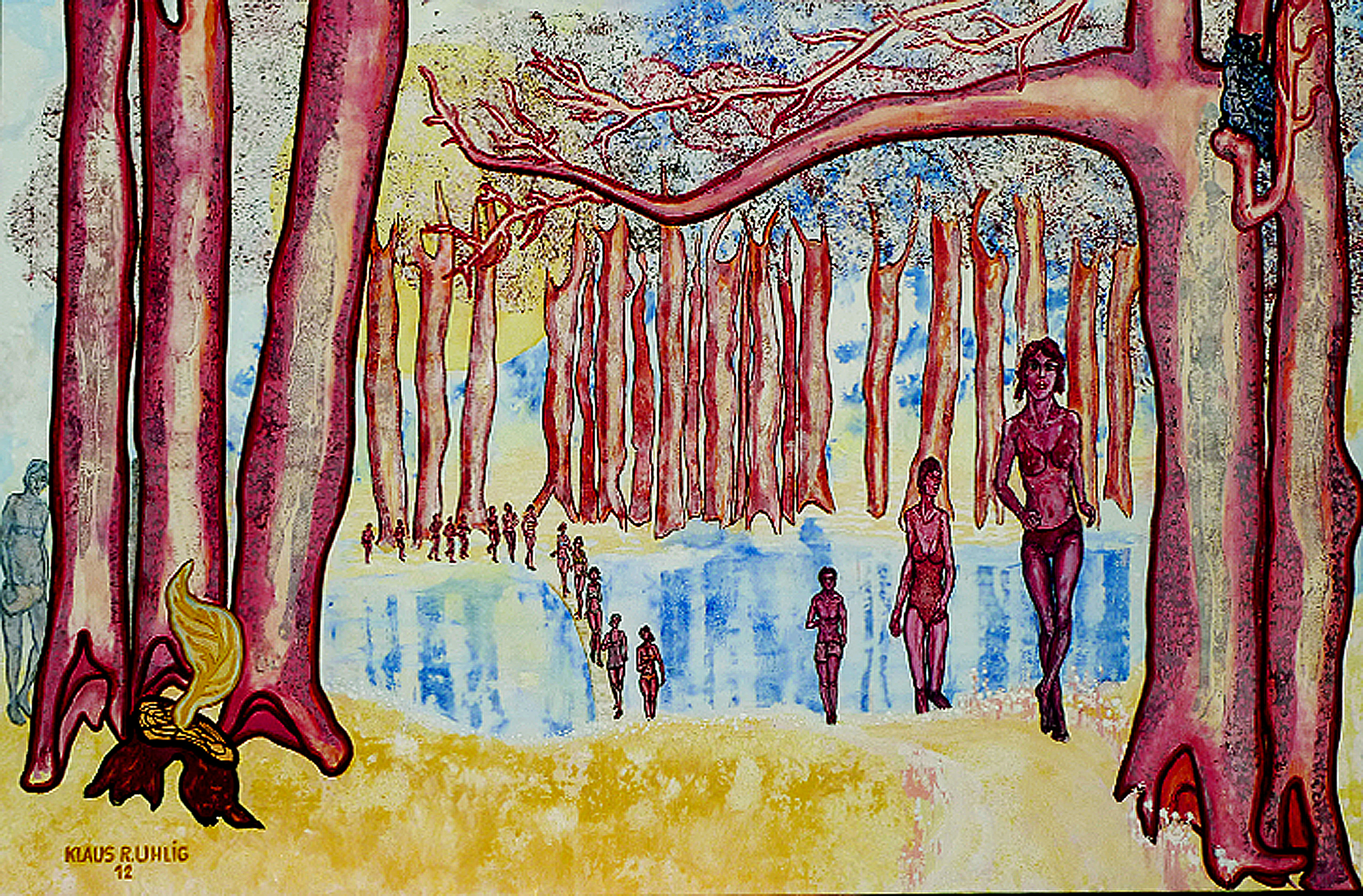 Rast am Blaubaumfeuer 2014 Öltempera a. Lw. 100x140